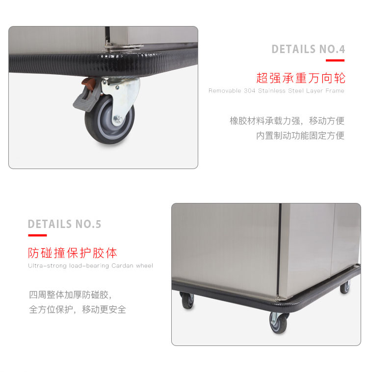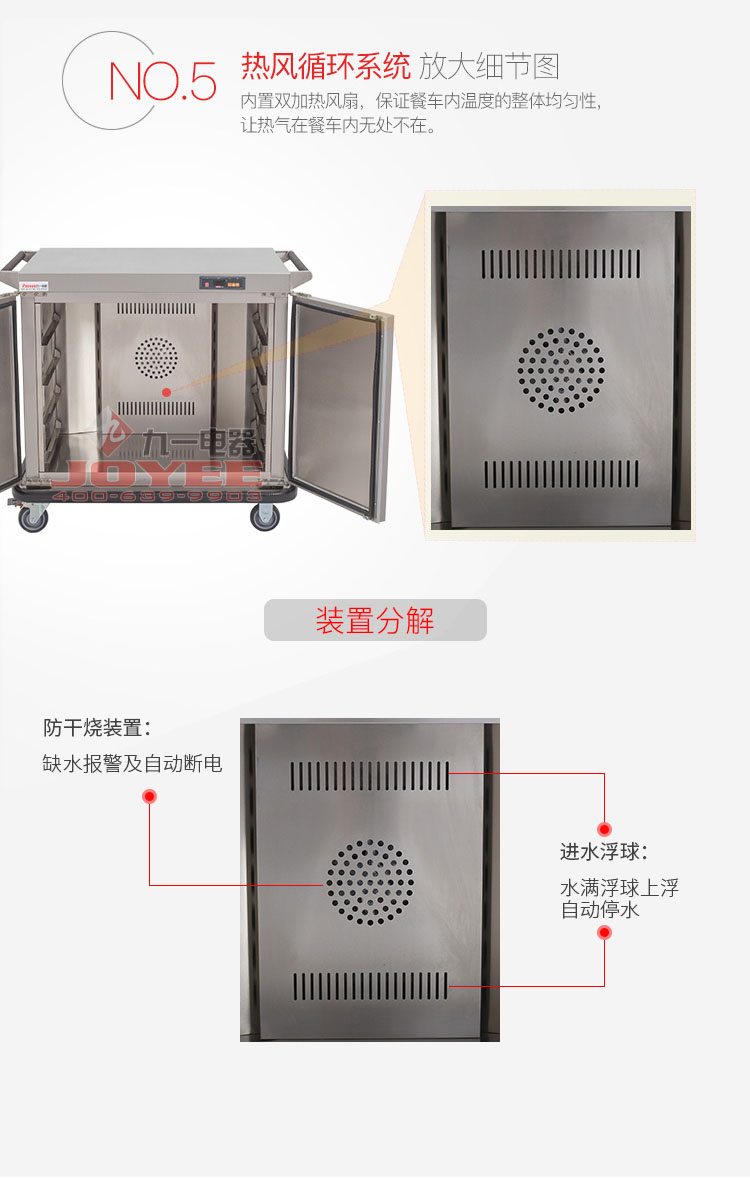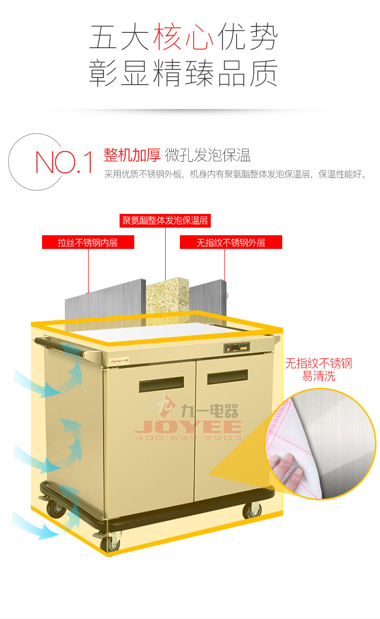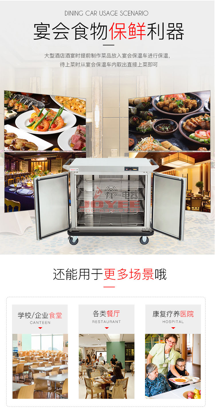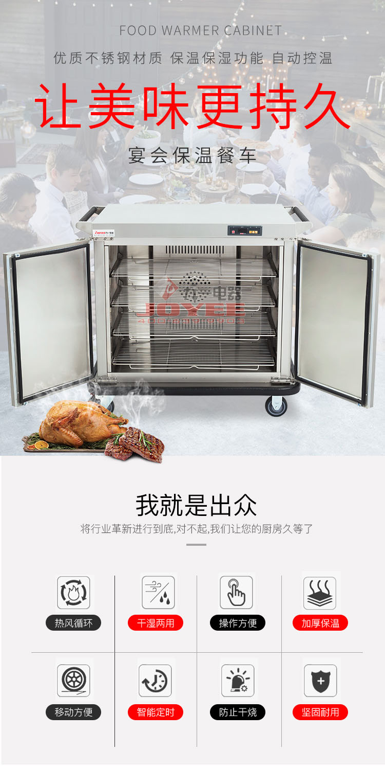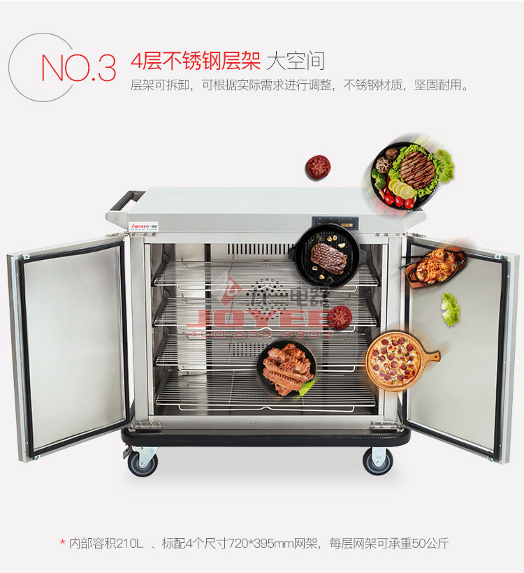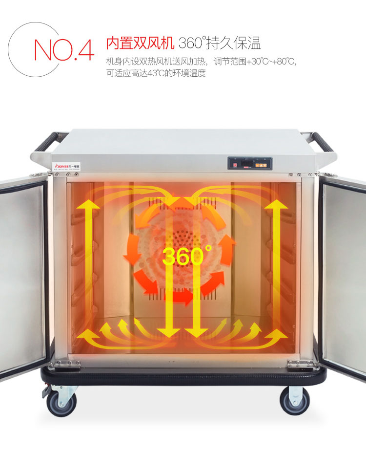 ①推車式設(shè)計方便移動②四層超大儲存空間③數(shù)顯按鍵溫度控制器④風(fēng)熱風(fēng)循環(huán)加熱系統(tǒng) ⑤全不銹鋼機身易清潔