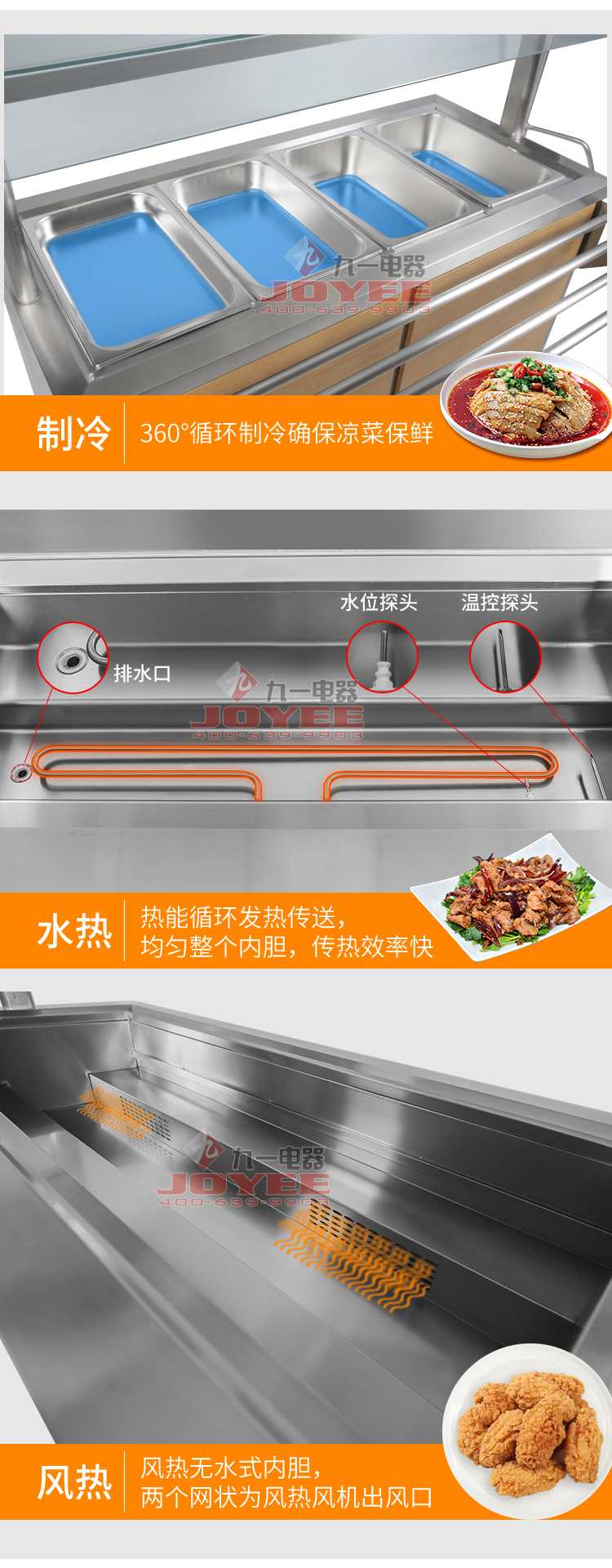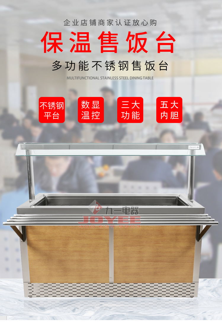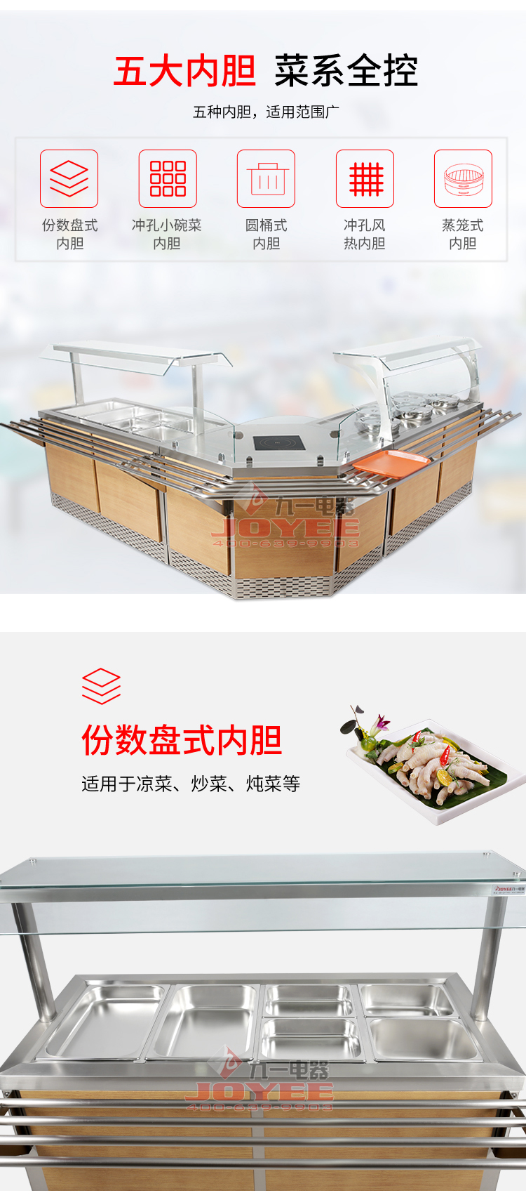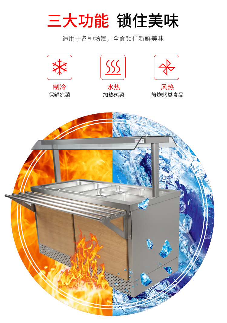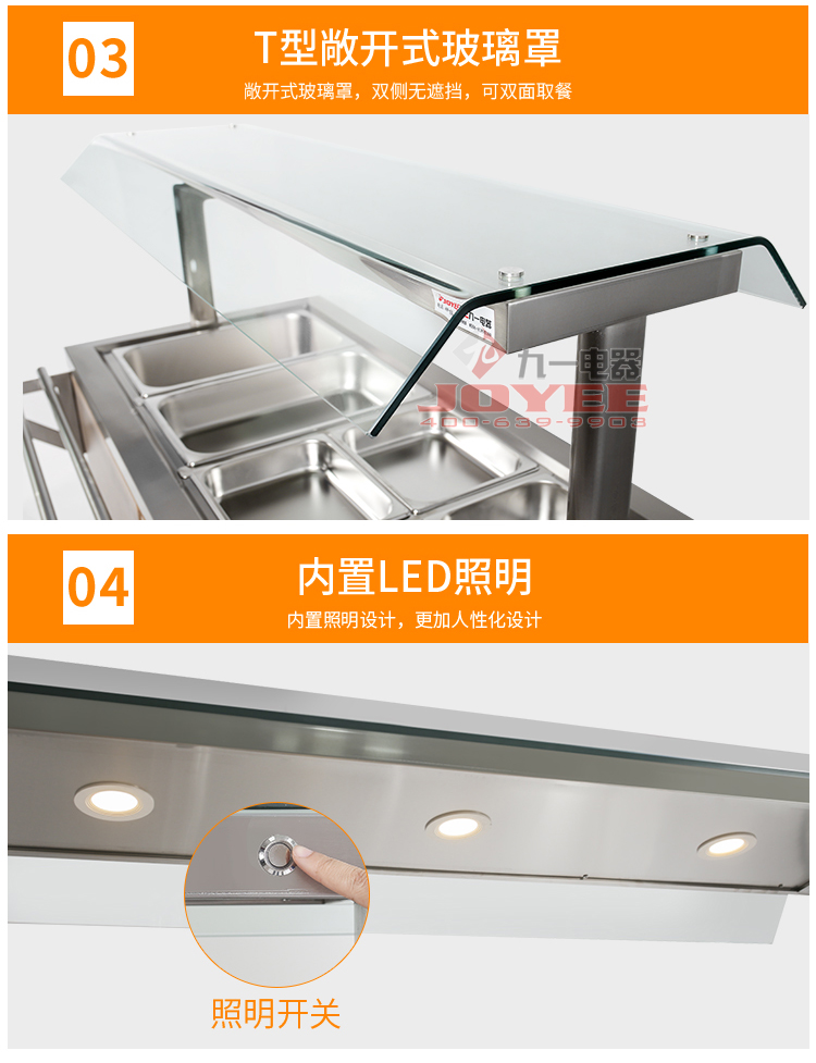 仿木紋裝飾板高端上檔次,前部圓管式平臺簡潔大方,T型敞開式玻璃罩適合自助餐,內(nèi)置LED射燈展示效果更佳,全304不銹鋼柜體,厚度1.2mm板材鍛造堅(jiān)固耐用!