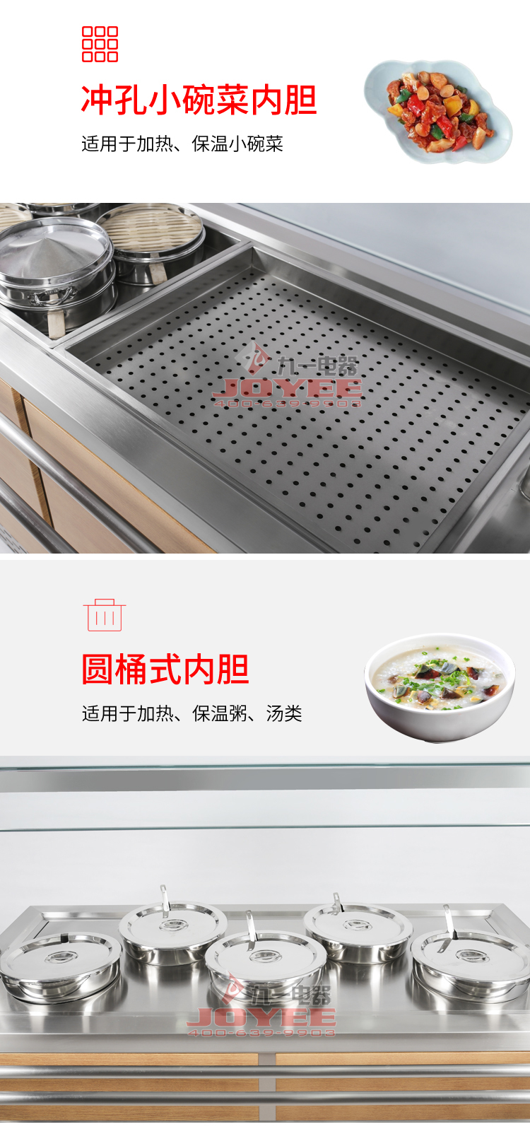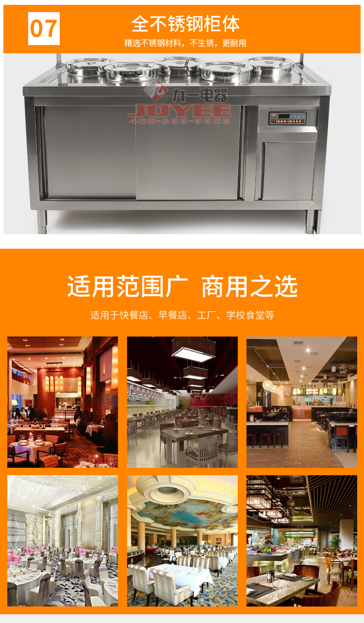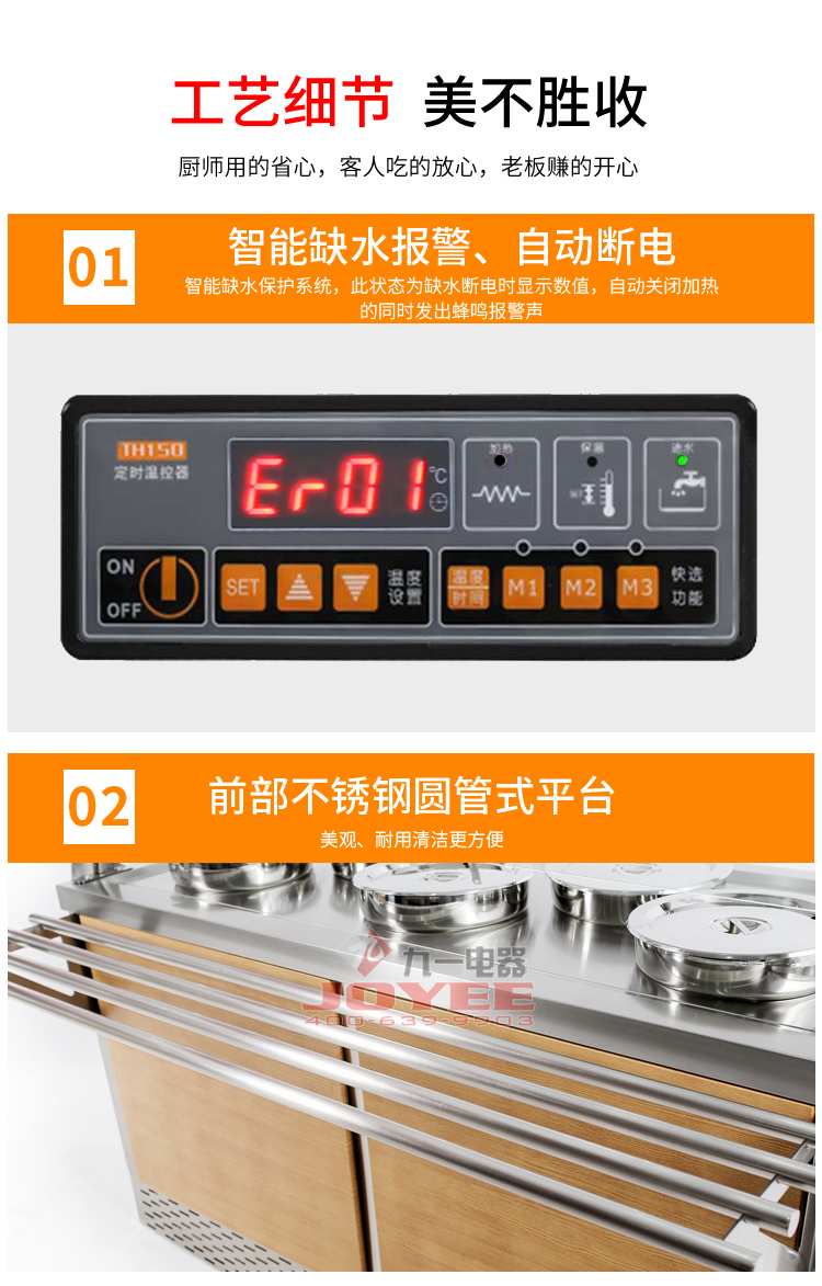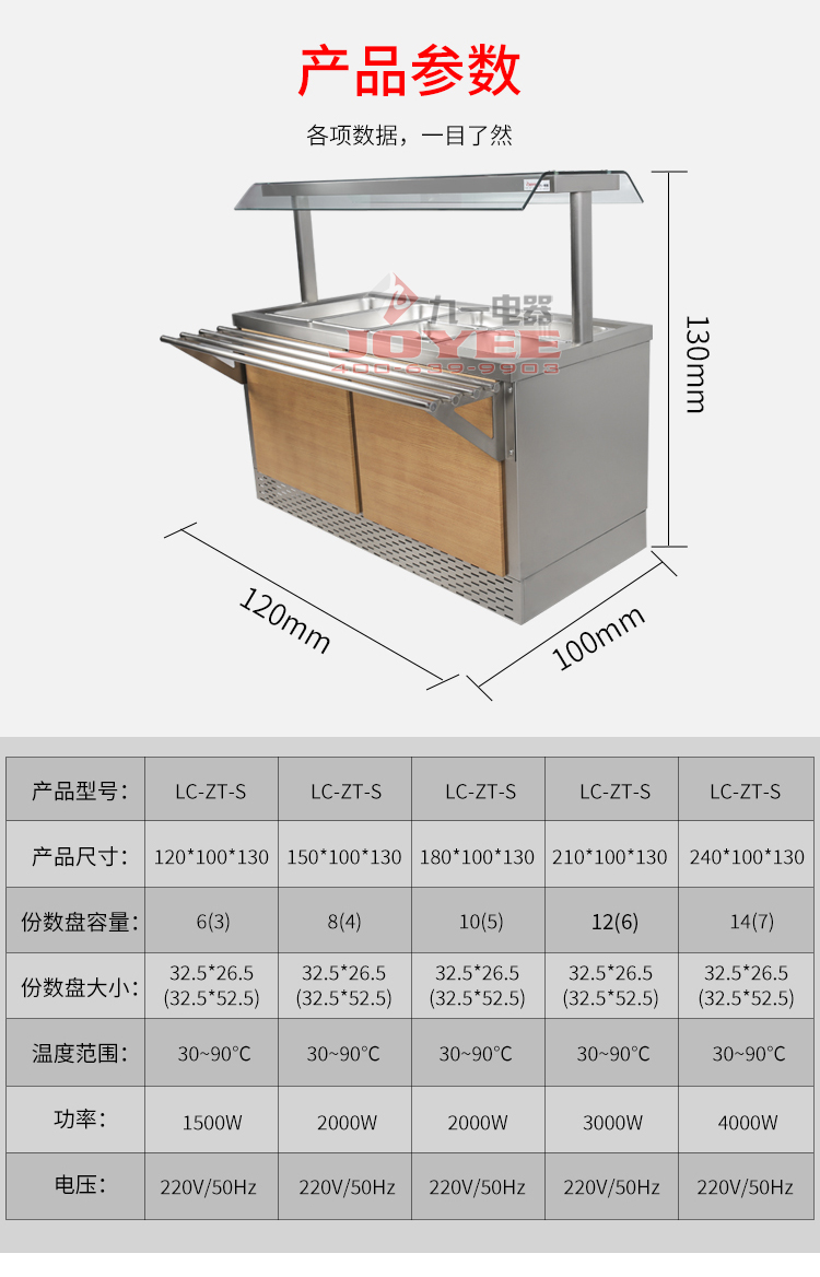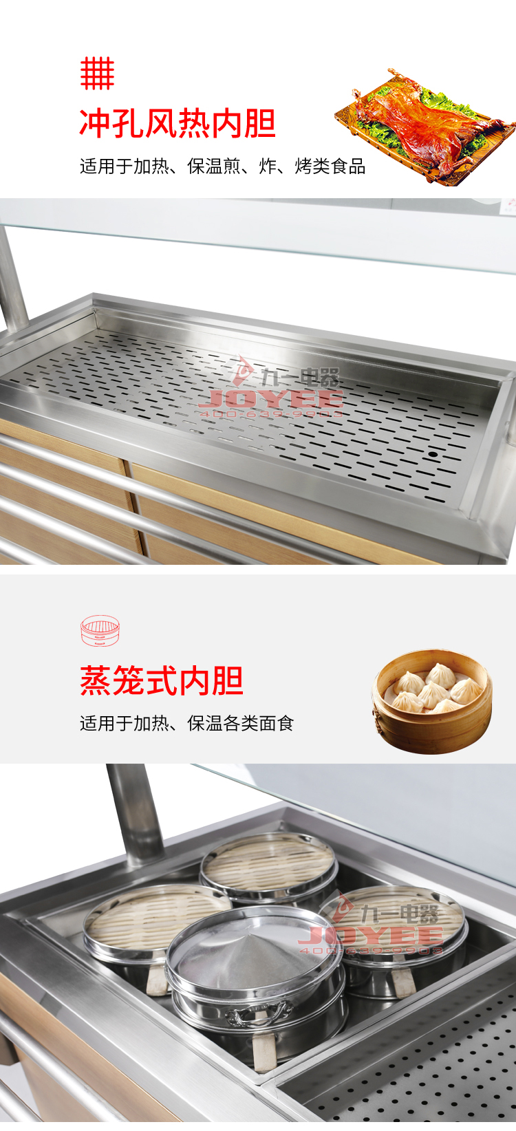 仿木紋裝飾板高端上檔次,前部圓管式平臺簡潔大方,T型敞開式玻璃罩適合自助餐,內(nèi)置LED射燈展示效果更佳,全304不銹鋼柜體,厚度1.2mm板材鍛造堅(jiān)固耐用!
