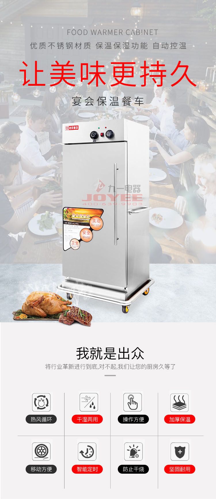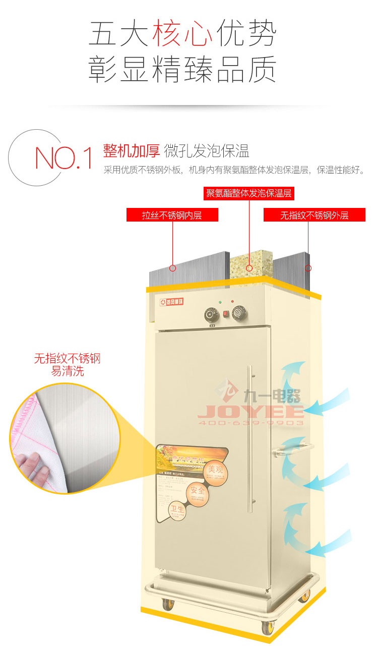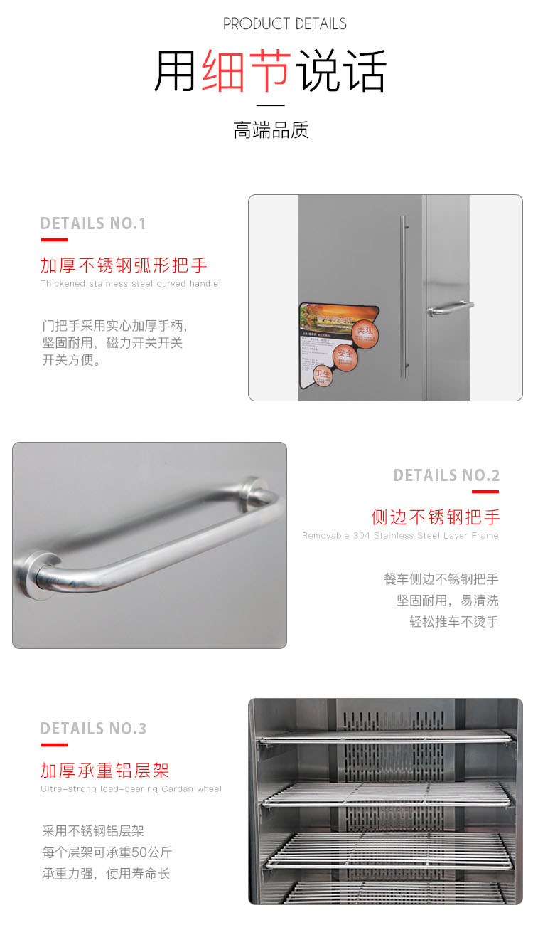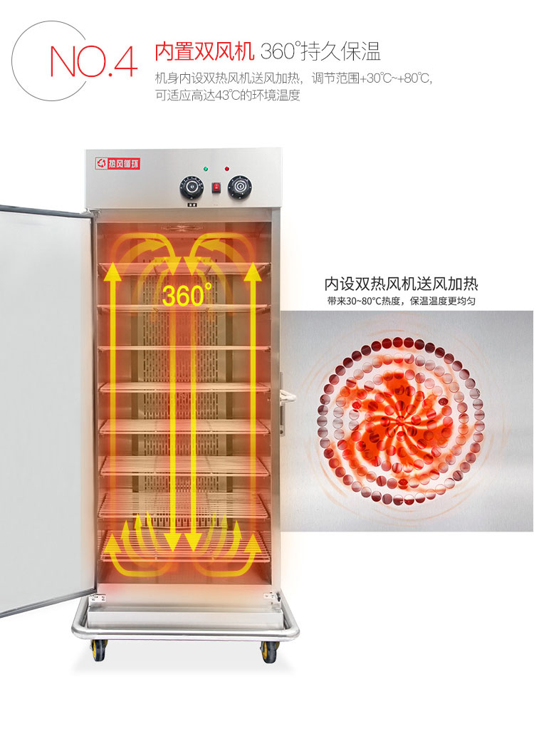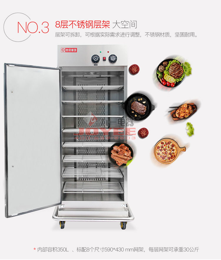 風熱風循環(huán)加熱系統(tǒng),柜內加熱快速均勻,全聚氨酯微孔發(fā)泡保溫層保溫效果更佳,8層超大存儲空間,純不銹鋼柜體堅固耐用。